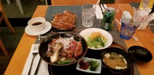 #InternationalFoodMission #OnTheMenu Teriyaki Chicken Bowl with Gyoza. The Teriyaki chicken bowl came in the American like hibachi serving…(with miso soup and side salad along with the entree) very large serving and trumps the standard teriyaki chicken bowls from the states. All washed down with Mizu and a 7up. Super filling. Definitely a step up from the serving size in the states. #PromoNate #WheresNate #RoamingNarita