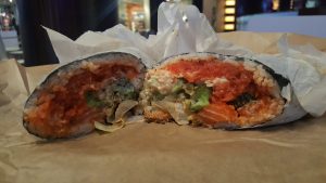 Next up on the #FoodMission…poke…#OnTheMenu The Firecracker…a poke burrito…(spicy ahi, Spicy salmon, crab, romaine, jalapeño, Japanese pickle, hot pepper, and Baja jalapeño sauce). Nice fusion mix…only gripe…it got messy fast…the Nori was pretty soft and it was more of a bite and tear action and try not to have the half unravel on you, rather than a simple bite…but still good…now to find a power outlet… #BatteryStruggles starting… #SushiLife #PromoNate #WheresNate #RoamingLasVegas