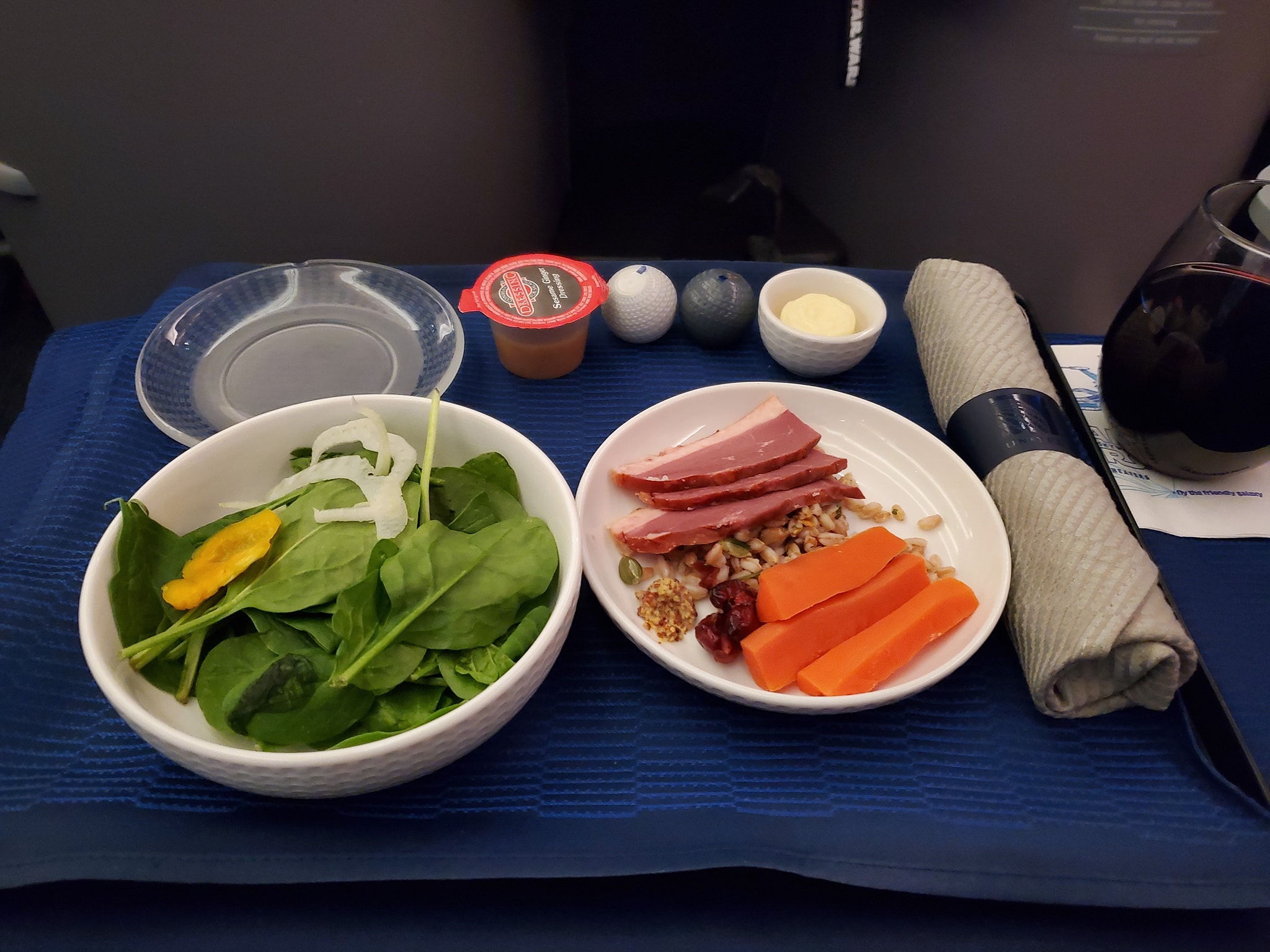 A little snackage. #OnTheMenu Smoked Duck and Farro Salad, Ginsing Chicken and Lemon Grass Chicken Potstickers, with Ice cream with strawberry topping #WashedDown Buffalo Trace on the rocks and California Blend Red wine. Everything paired up nicely…there was a selection of breads that came out mid meal. I thought the bowl will bee more of a bowl…but it was more like a soup with very little broth…not bad though…surprisingly filling. Ice cream…as usual…give it a few minutes to go from diamond hard to scoopable. Now…3 some.hours into the flight and 14hrs to go….I’m definately gonna get a few more buffalo traces to tie the night down. #FoodMission