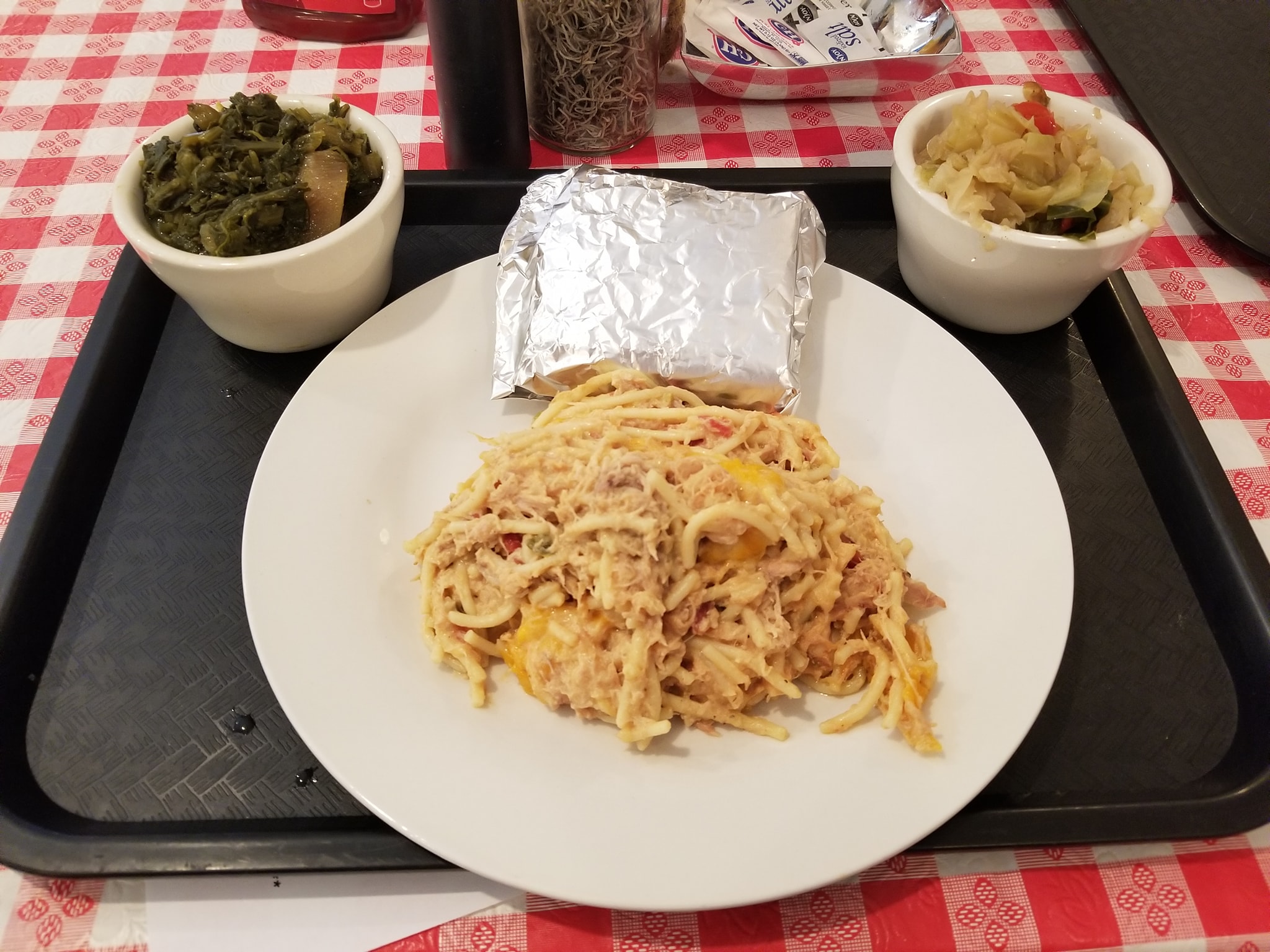 A quick in between lunch. #OnTheMenu Chicken Spaghetti with Greens and Cabbage. #WashedDown with a Sweet Tea. Small tacked away soul food spot. They have a varying menu each day…its a cool family owned restaurant. Never had chicken spaghetti before…but it was really good…cabbage was ok… but the greens were the best of the sides. Definately southern charmed spot here…kinda got the itis now#FoodMission #DiscoveringTexas #WheresNate #RoamingTexarkana