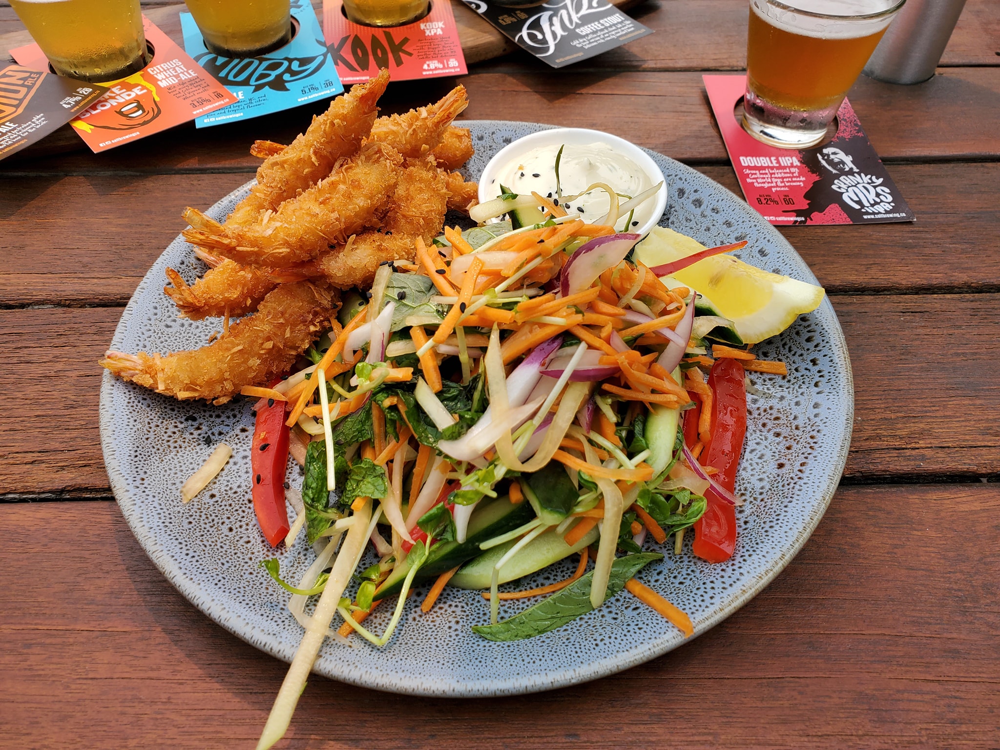 Been sorta up since 8am…with only water to hold me over…so it was a done deal when I come.across a #BreweryTour with food at a stop along the way. #OnTheMenu Coconut encrusted Prawns with green papaya, asian veggies and herb salad nuol cham dressing and citrus aioli. #WashedDown @Salt brewery paddle (Salt, Session Ale, Fake Blonde, Moby, Kook, ink coffee stout, and Cranky Mrs IPA). I was expecting small shrimp but these were decent sized and a good amount as well…the garden salad was pretty filling as well. Outside patio area with open seating and cool breezes blowing in.