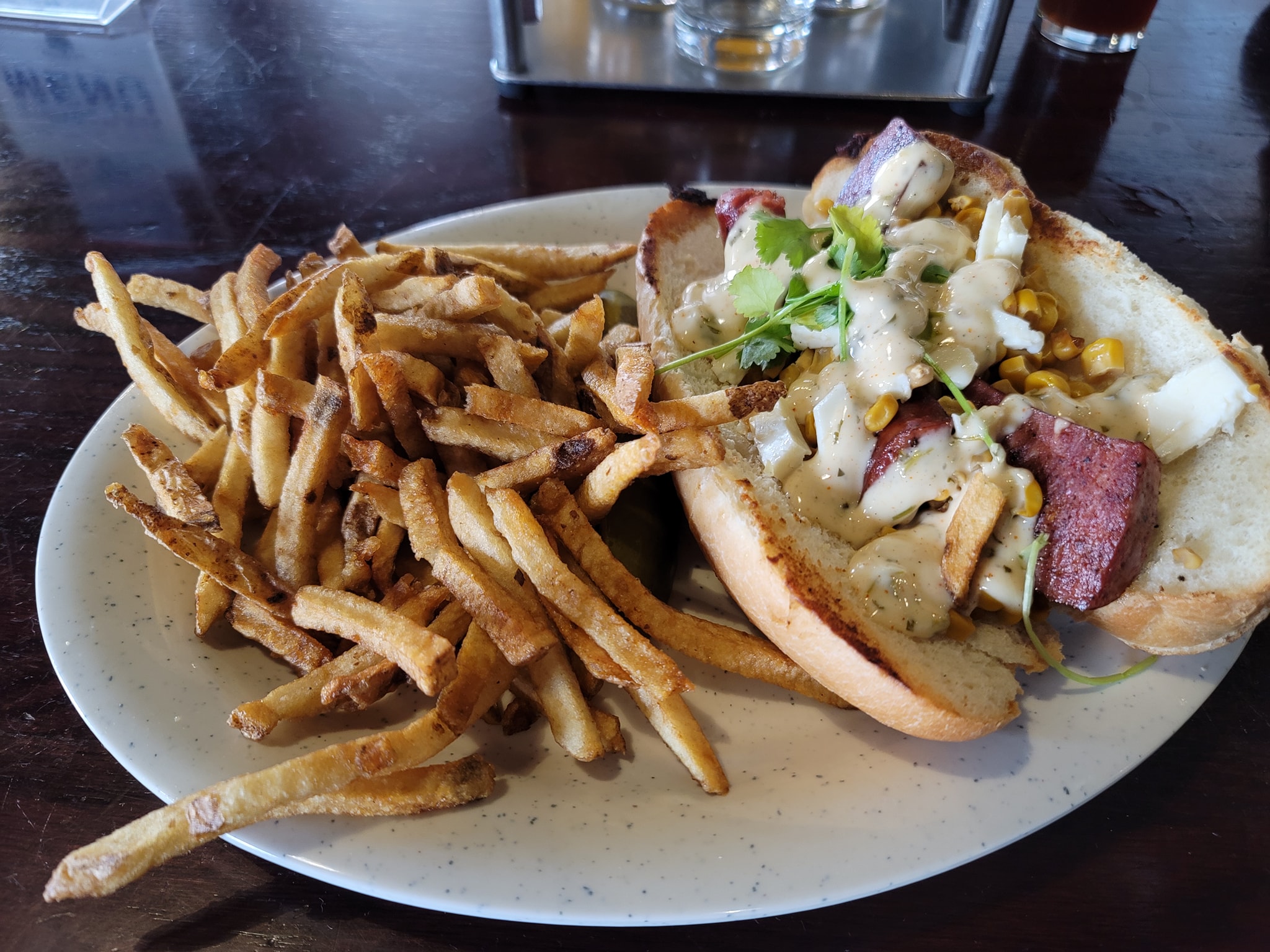 Had to get some #BreweryTour and snacks to alleviate the crap of the day. #OnTheMenu Lagniappe Cajun-inspired sandwich grilled Andouille sausage covered with elote, spices, lime, mayo, cilantro, and cotija cheese. #WashedDown with Six Shooter sampler (Chocolate Stout, High Scaler Pale Ale, Ocho Loco IPA, Historic Helles, Powder Monkey Pilsner)