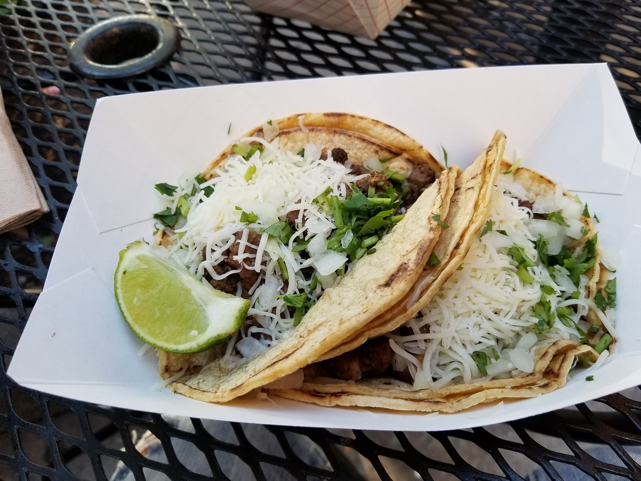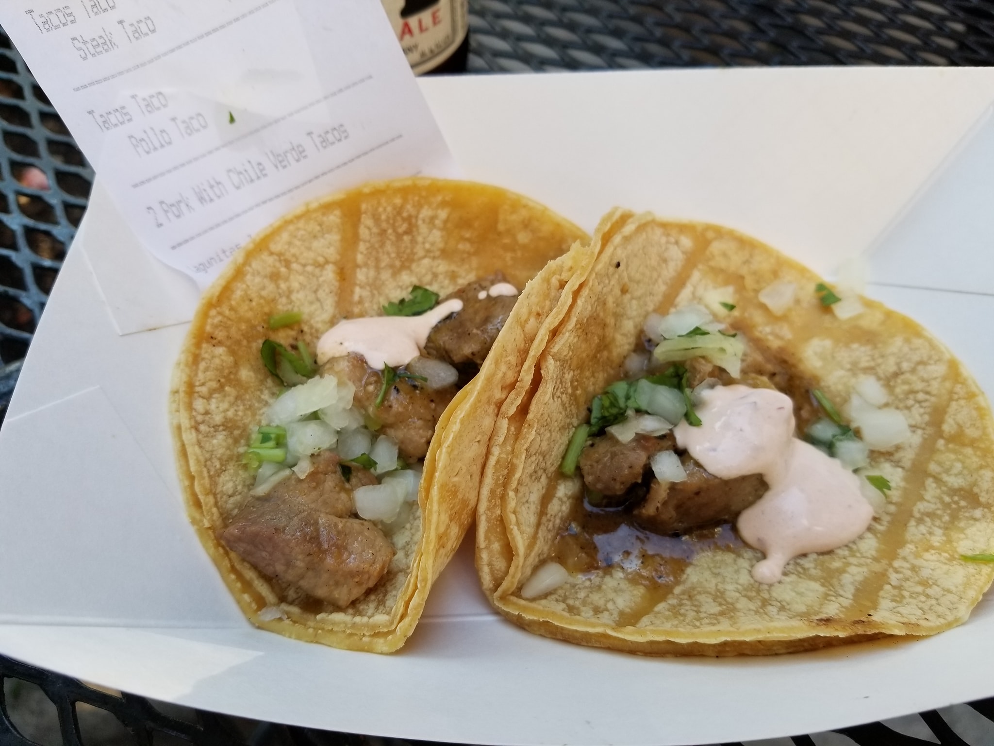 Starting off #TacoTuesday #OnTheMenu 2x Pork Chile Verde, Carne Asada, and Pollo #WashedDown with a Lagunitas IPA. The 2 pork Chile Verde tacos…looked pretty disappointing…at 1st I thought some meat fell off…but they are just $1…and they are good…but damn… where is the meat. The steak and chicken tacos did hit the spot…the Carne asada did have a few bites of just straight gummy fat…but still…filling. the cheese did throw the whole traditional street taco off just a tad bit. Nice snack to start off the roaming this evening. Just Outside eating and people-watching. #BeerAndTacos #FoodMission #PromoNate #WheresNate #RoamingChicago