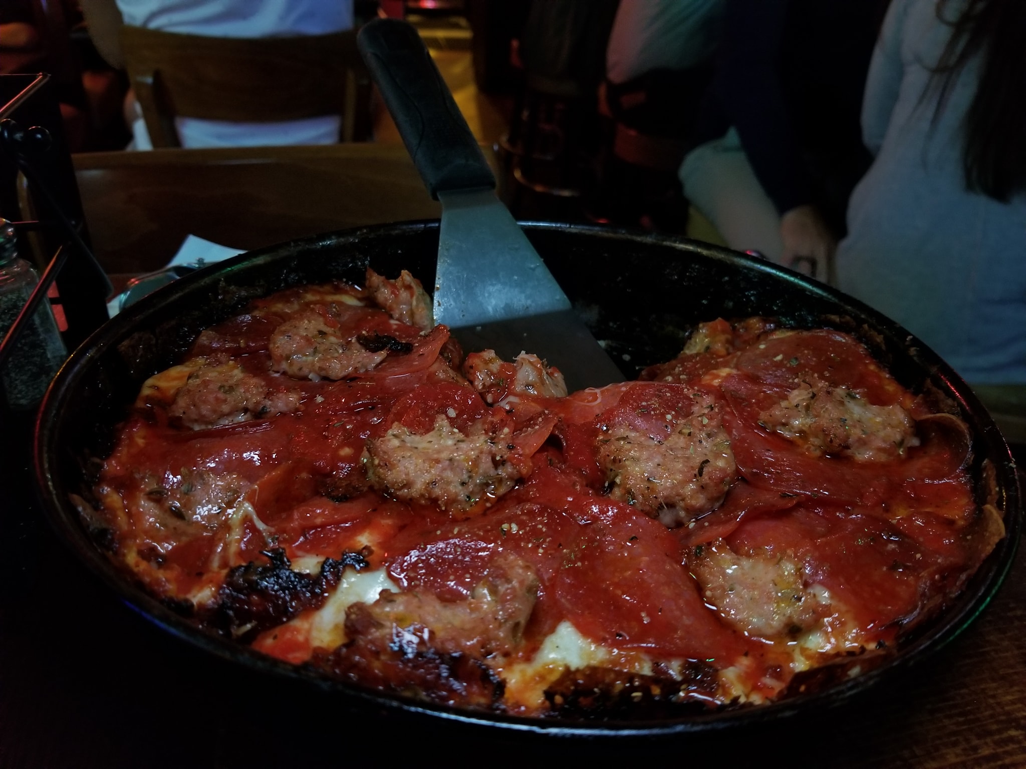 15.5hr day…yeah…and I’m like Super Saiyan Hangry. So… #OnTheMenu Small Pepperoni and Sausage pan (Deep Dish) pizza. #WashedDown with a Goose Island 312 and a Half Acre pony pilsner. So with the pizza…I Started basic…since they don’t offer outlined pizza with specific toppings…so just went with the normal…Pepperoni and Sausage. They are known for their crust though…caramelized. 1st bite was pretty awesome…well the devourment…once I got to the 2nd slice…it was pretty good…Pepperoni layered the top like a blanket…when I finally got to the crust I admit it was a different taste than those other deep dish places. but prob gonna try to do a major deep dish comparison run. I can’t compare pizza 6mo apart. Lol, this is definitely far from your restaurant-style deep dish location. #PromoNate #WheresNate #RoamingChicago #ChicagoDeepDish