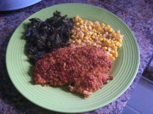 So decided to cook dinner for myself and the roomies…bacon bits n sharp cheddar cheese encrusted chicken breast with mixed greens and lemon roasted corn