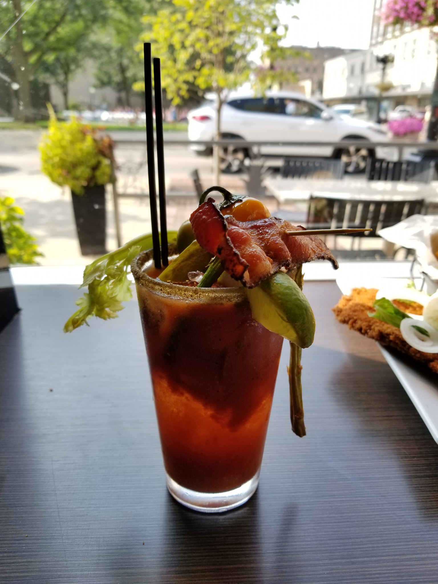 So walked around…saw a wedding…and was definately hungry #OnTheMenu Iowa Pork tenderloin sandwich. #WashedDown with a Newtons Bloddy Mary. A sandwich is an understatement…as you can see it overlaps the bun. I opted for breaded and it was pretty amazing…add in a little hot sauce and it’s a done meal. The bloddy mary was pretty interesting…had a little kick to it as well. So yeah…super huge portion…straight from Iowa.