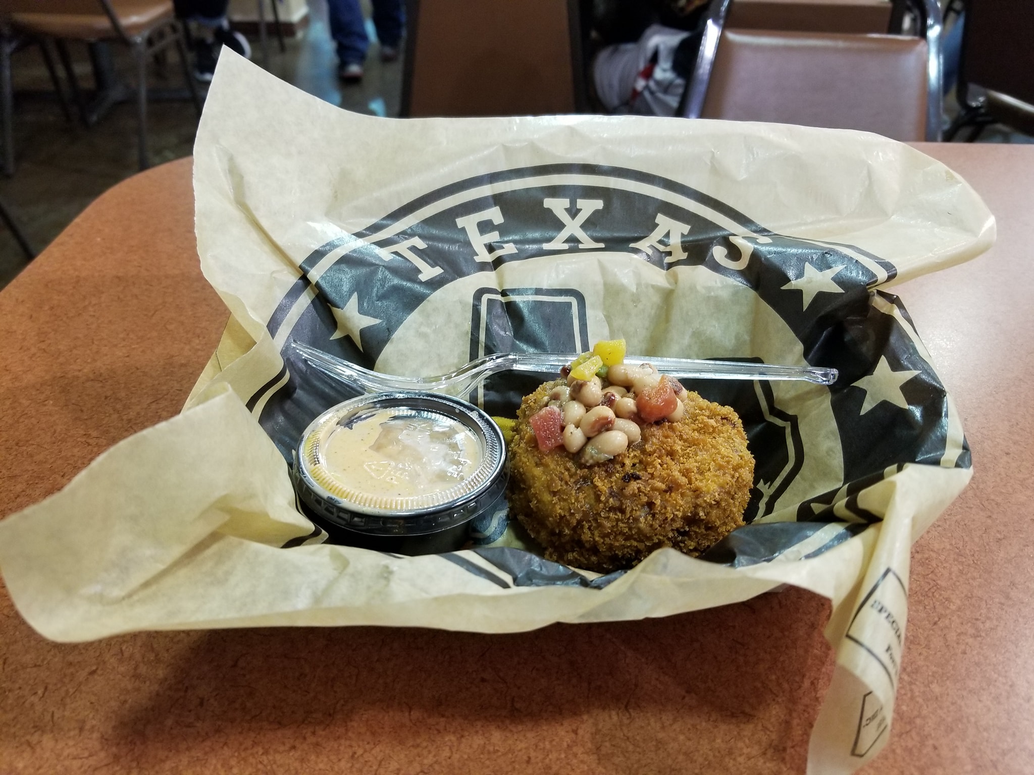 And continuing the #StateFairFoodMission…we have #OnTheMenu Fernie’s Hoppin’ John Cake with Jackpot Sauce. Regarded as a New Year’s Eve southern “good luck” plate that gets deep fried. [Black-eyed peas, white rice, spicy smoked sausage, green onions, and a secret spice blend with a bread crumb and topped with panko. It’s finished with black eye peas, with pickled okra, and a side of Jackpot Sauce]. Although a pretty small portion size… it’s surprisingly filling. I can distinctly remember biting into pieces of sausage…lol. this is well worth it. 16 Tickets. #ICameHereForTheFood #StateFairFoodMission #FoodMission #WheresNate #RoamingDallas