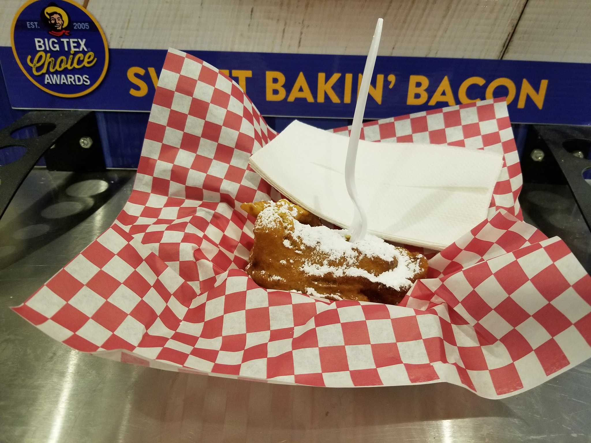 And moving on #StateFairFoodMission is still on the sweet side…#OnTheMenu Take cream-filled sponge cake wrap it in bacon…then dip it in funnel cake. batter and deep fry it….add powdered sugar and this is what you get. Not a bad mix… a pretty good sweet and salty mix…i would…prefer the bacon a little crispier…but that’s just me. This is a good comeback from that last dish I had. 20 tickets. #ICameHereForTheFood #StateFairFoodMission #FoodMission #WheresNate #RoamingDallas